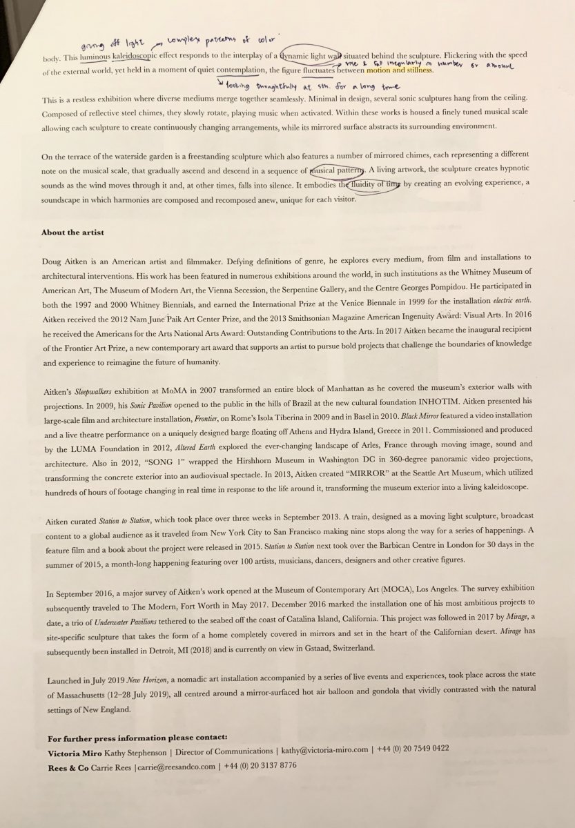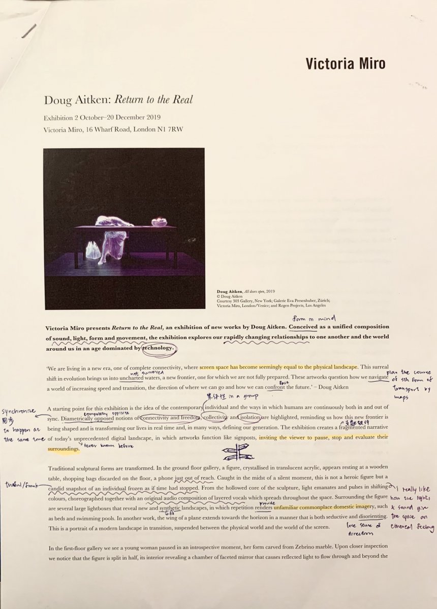 I love the work of Dong Aitken, which encourages me to work with other mediums other than paint. His brilliant choices of media inspire me to be more open in terms of medium. He uses aluminum lightboxes to show images in which paintings could not achieve the feeling. I am also really like the sensation of being in the exhibition. The psychedelic lights that the sculpture created and the mysterious music just makes me want to feel more of it.