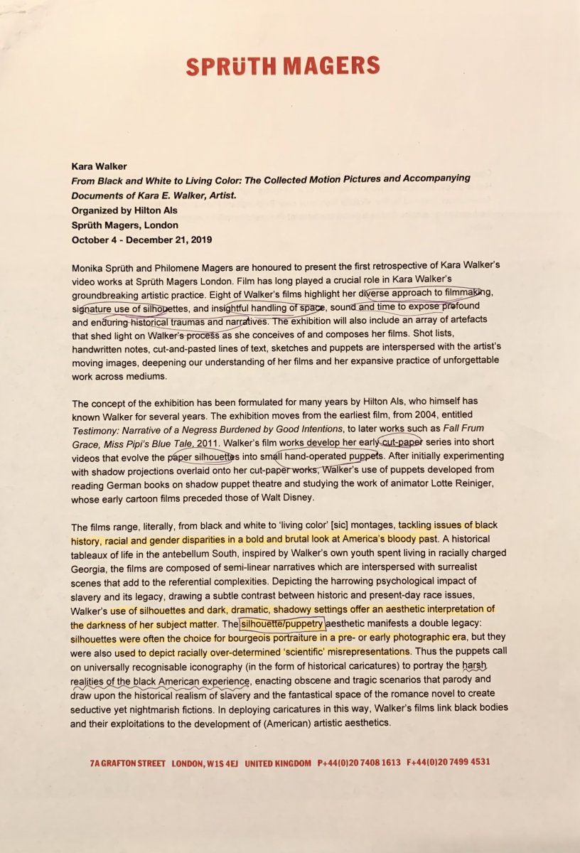 I also like the work of Kara Walker. I saw her work, Fons Americanusat, at Tate Modern. It has a really different taste between the two, but both are about her identity; about Black of history. I like her paper silhouettes and her way of storytelling. I feel like it's a person who really loves her nationality, and what to use her own way to share them with the public.