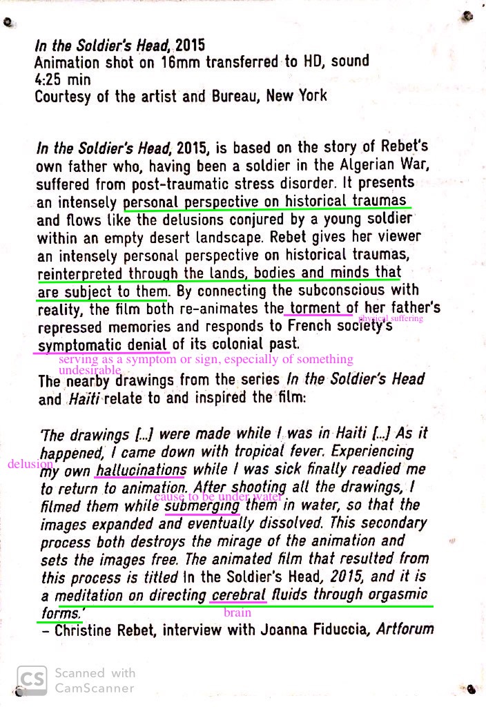 I was figuring out how to combine traditional art (drawing and painting for instance) with technology. Then I found this artist who combines them perfectly. I really really like one of her work called "In the Soldier's Head", where she uses video that watercolor dissolves in the water and combine with the animation she draws.